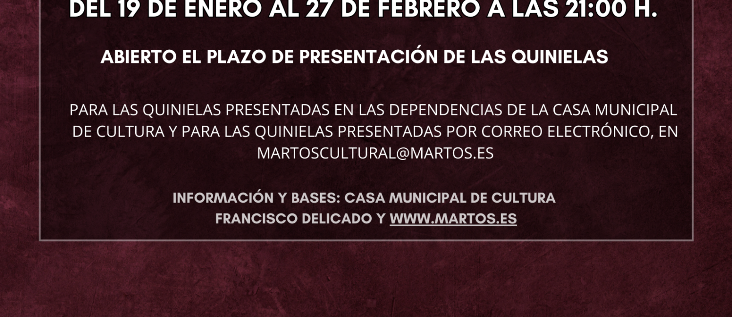 Desde el 19 de enero hasta el 27 de febrero, a las 21:00 h, para las quinielas presentadas en las dependencias de la Casa Municipal de Cultura Francisco Delicado y, para las quinielas presentadas por correo electrónico, en martoscultural@martos.es