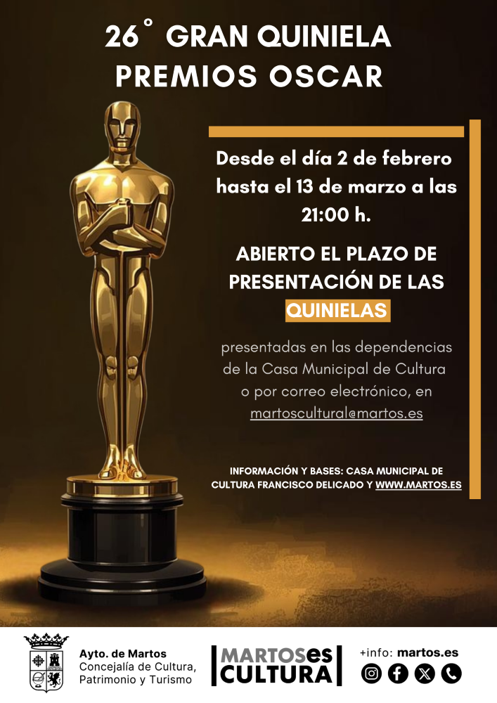 Participa en la 26ª Gran Quiniela de los Oscar que organiza la Concejalía de Cultura del Excmo. Ayuntamiento de Martos. Elige a tus favoritos en cada una de las 23 categorías, y si eres la persona que más aciertos tenga conseguirás dos entradas para la obra de teatro ‘Poncia’ protagonizada por Lolita Flores, en el Teatro Municipal Maestro Álvarez Alonso el 18 de abril de 2026.