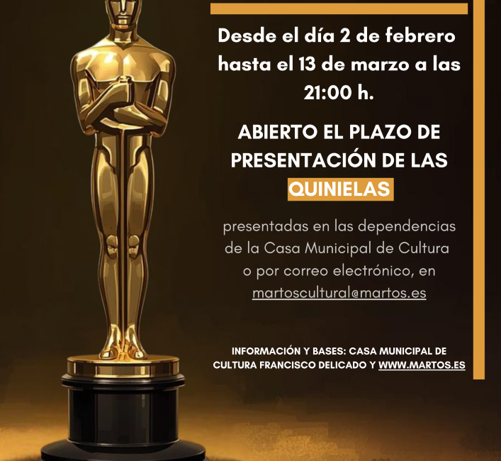 Participa en la 26ª Gran Quiniela de los Oscar que organiza la Concejalía de Cultura del Excmo. Ayuntamiento de Martos. Elige a tus favoritos en cada una de las 23 categorías, y si eres la persona que más aciertos tenga conseguirás dos entradas para la obra de teatro ‘Poncia’ protagonizada por Lolita Flores, en el Teatro Municipal Maestro Álvarez Alonso el 18 de abril de 2026.