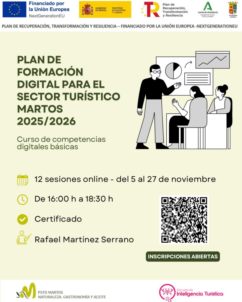 Una iniciativa del Ayuntamiento de Martos e Inteligencia Turística, dentro del Plan de Sostenibilidad Turística en Destino (PSTD) de Martos “Naturaleza, Gastronomía y Aceite”, en el Plan Territorial de Sostenibilidad Turística de Andalucía 2023, financiado por la Unión Europea – NextGenerationEU.