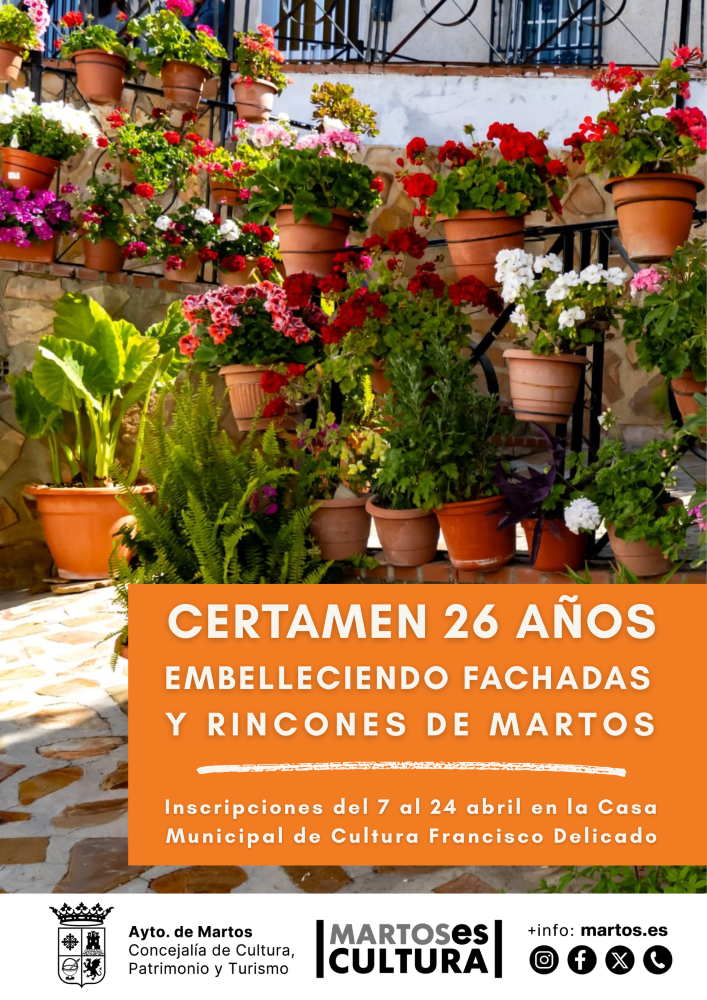 Desde el día 7 al 24 de abril de 2026 está abierto el plazo para participar en la actividad “26 Años embelleciendo fachadas y rincones de Martos”.