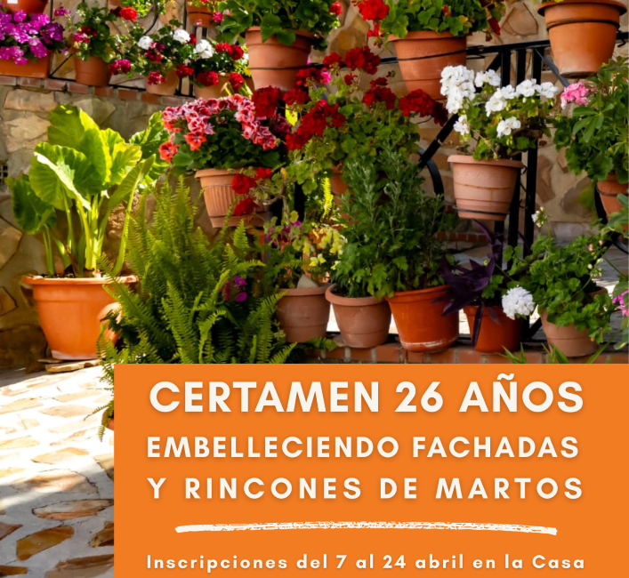 Desde el día 7 al 24 de abril de 2026 está abierto el plazo para participar en la actividad “26 Años embelleciendo fachadas y rincones de Martos”.