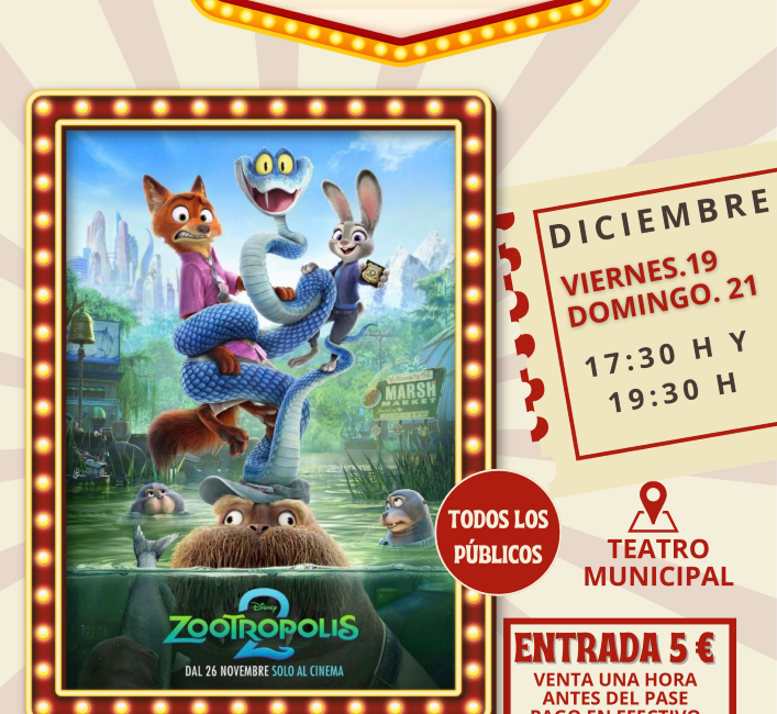 Los próximos días 19 y 21 de diciembre, en el Teatro Municipal Maestro Álvarez Alonso, tendrá lugar la proyección de la película ‘Zootropolis 2’.