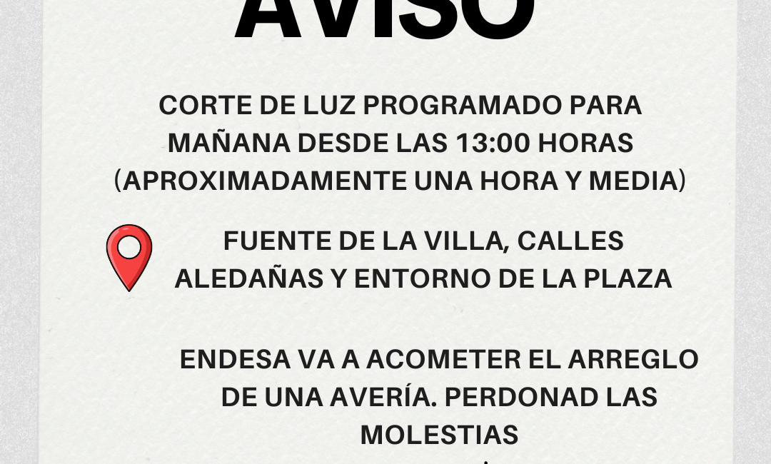 Endesa nos informa que va a acometer el arreglo de una avería importante.