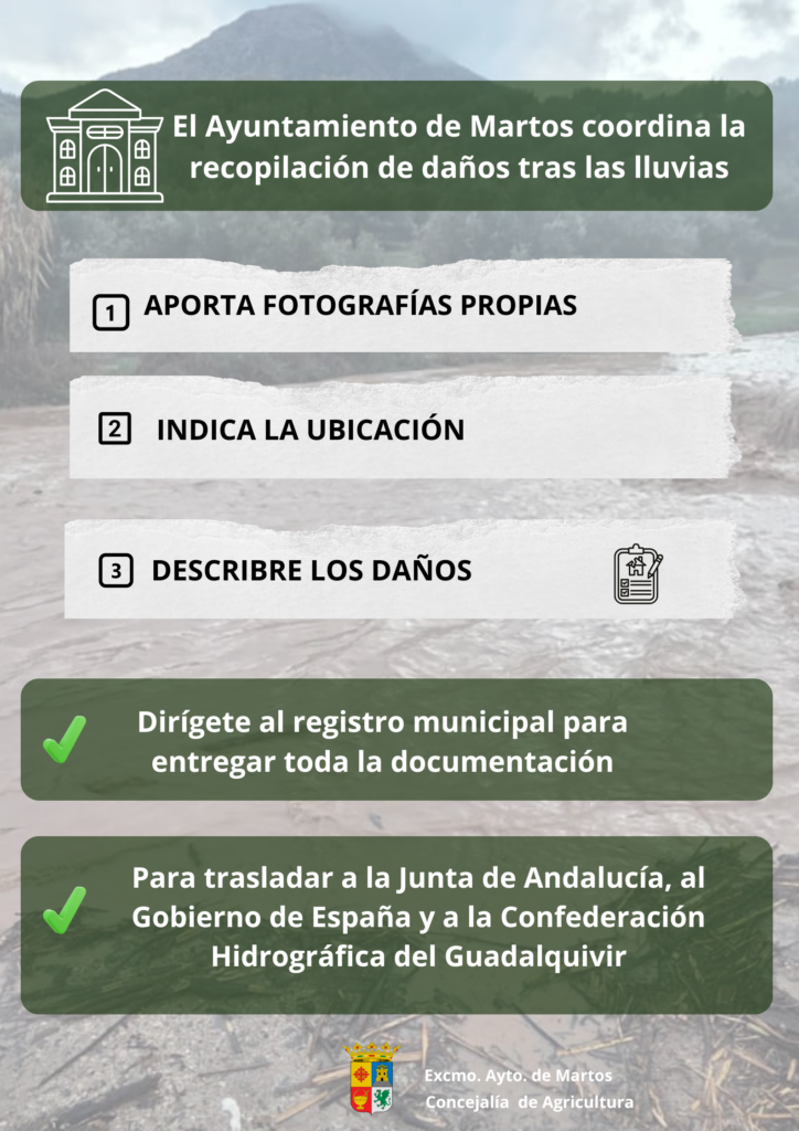 Ayudamos a las personas afectadas por el temporal con recursos municipales. En el Registro Municipal recogeremos los datos para enviarlos a la Junta de Andalucía, el Gobierno de España y a la Confederación Hidrográfica del Guadalquivir. Nuestro objetivo es defender los intereses de los sectores agrarios y ganaderos y paliar los efectos.