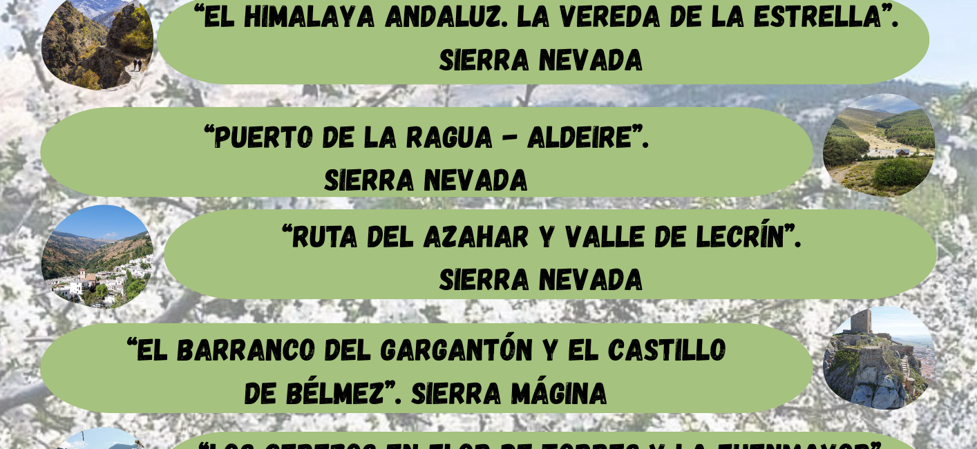 El programa se completa con dos rutas en Sierra Mágina, al Barranco del Gargantón y el Castillo de Bélmez, así como a los cerezos en flor de Torres y la Fuenmayor. Finalmente, en la Sierra de Cazorla se visitarán el Puente de las Herrerías y la Cerrada del Pintor, además del río Cañamares.