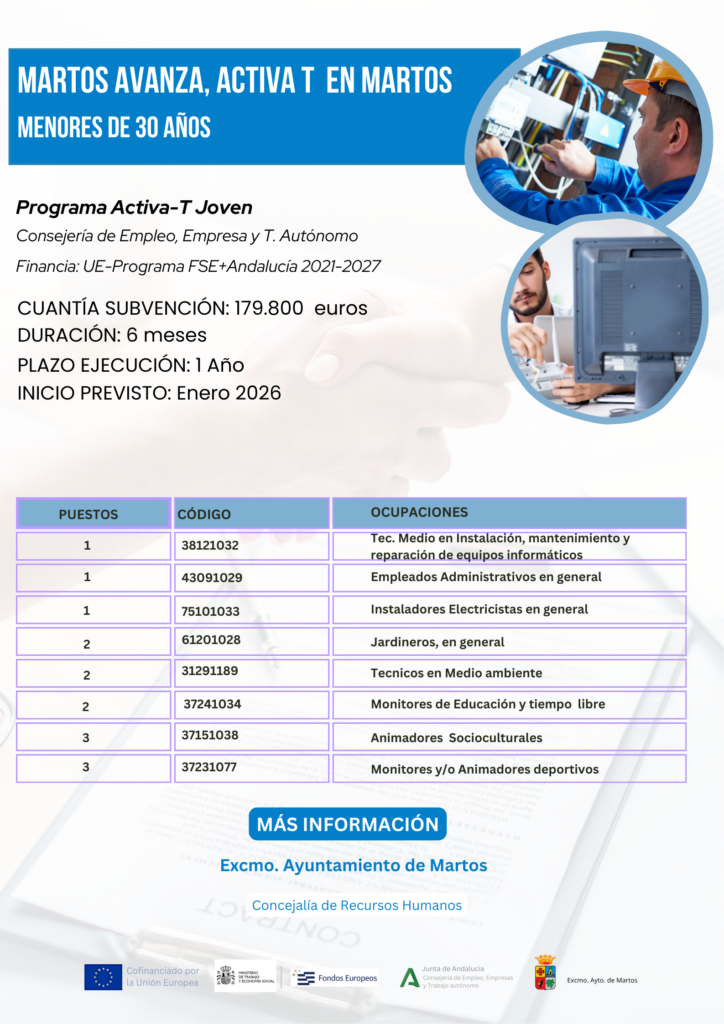 El Ayuntamiento de Martos pone en marcha el Programa Activa-T Joven, una iniciativa para fomentar la inserción laboral de personas jóvenes desempleadas del municipio.