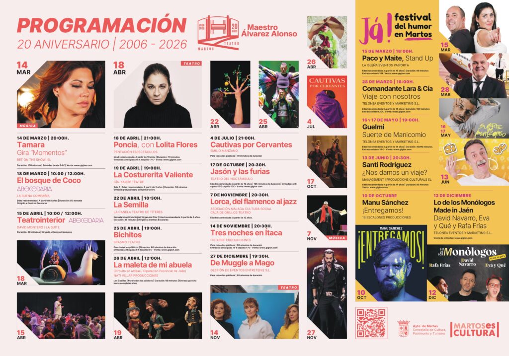 El Ayuntamiento de Martos ha presentado el adelanto de la programación cultural que se desarrollará a lo largo de 2026 con motivo del 20 aniversario de la inauguración y puesta en marcha del Teatro Maestro Álvarez Alonso. Una efeméride que el consistorio quiere celebrar con una oferta cultural amplia y variada que incluye teatro, música, espectáculos familiares y mucho humor.