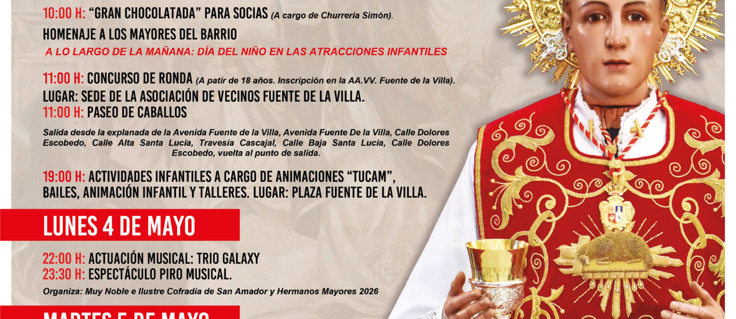 El lunes, 4 de mayo, a las 23.30 horas se podrá disfrutar de un espectáculo piro musical organizado por la cofradía de San Amador y Hermanos Mayores y el domingo 5 de mayo, Festividad del Patrón será la solemne procesión de San Amador, con el siguiente itinerario: Plazoleta de San Amador, La Fuente, Plaza de la Constitución, Real, San José, Dolores Torres, Plaza Fuente Nueva, San Francisco, Fuente del Baño, Las Huertas y Plazoleta de San Amador.