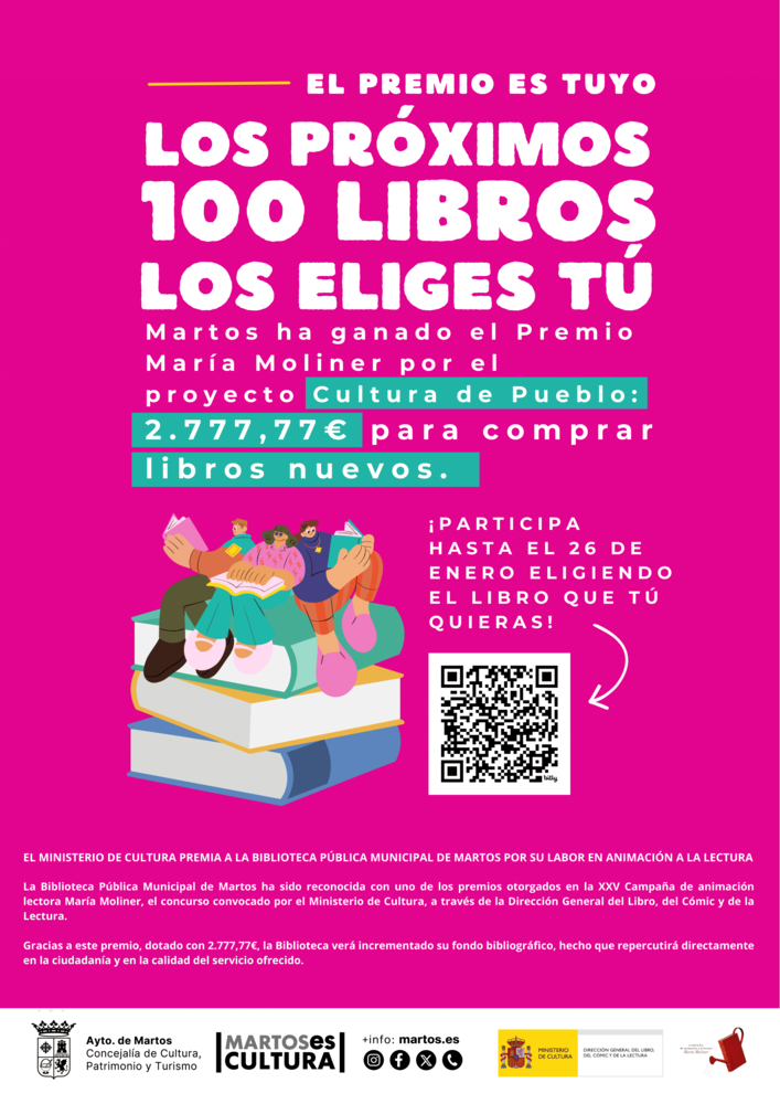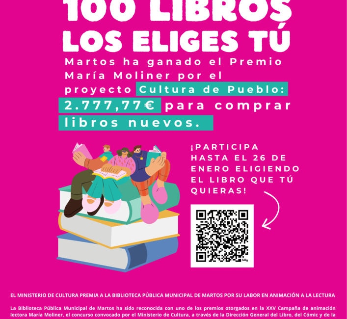 Participa hasta el 26 de enero eligiendo el libro que tú quieras, puedes hacerlo de forma presencial en la Casa Municipal de Cultura Francisco Delicado, a través del formulario bit.ly/tueliges100libros o mediante este código QR