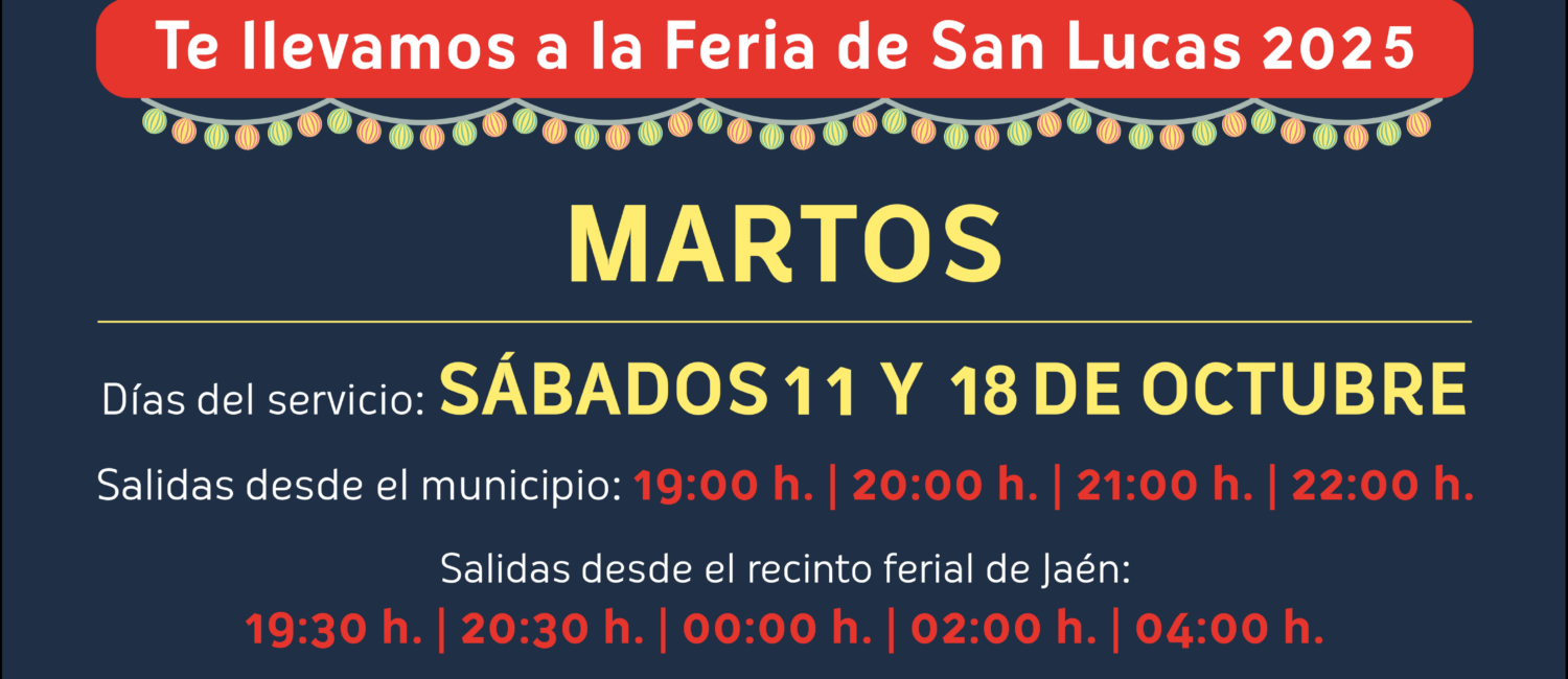 El Consorcio de Transporte Metropolitano del Área de Jaén nos informa del dispositivo especial de transporte público con motivo de la Feria de San Lucas. Toda la información estará disponible en la web del Consorcio www.ctja.es. El lugar de parada habilitado será el de todos los años.