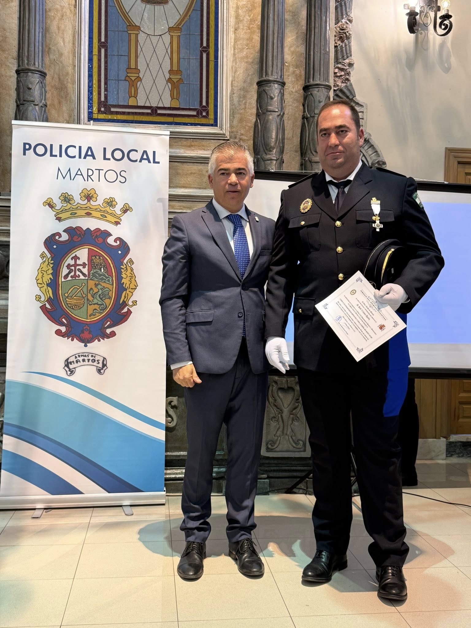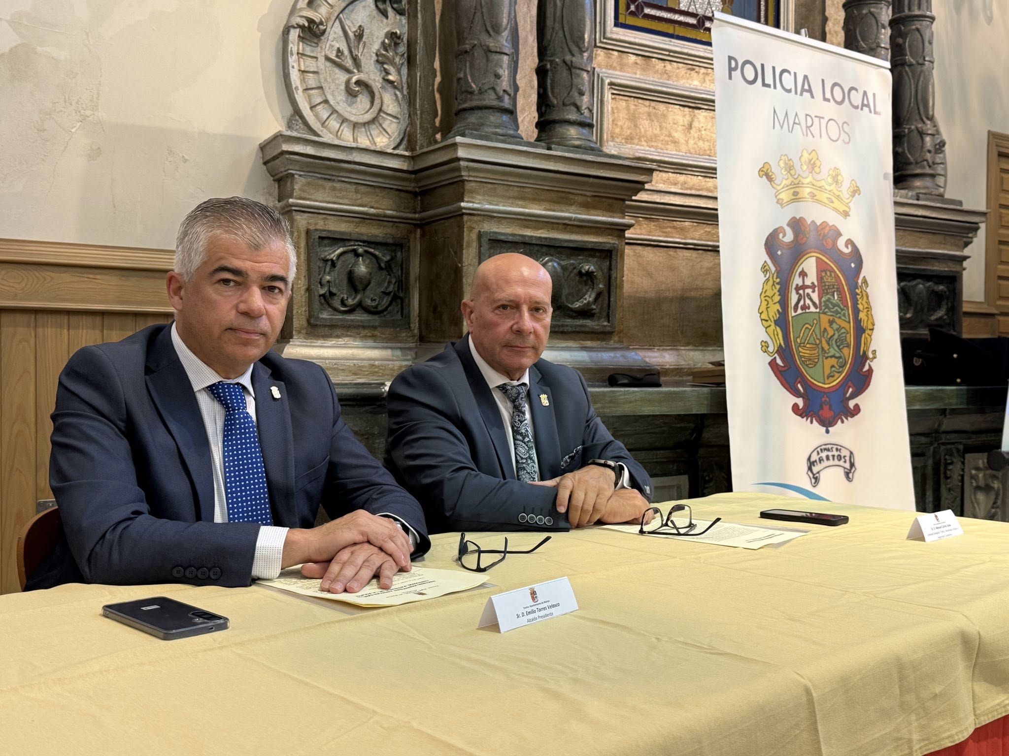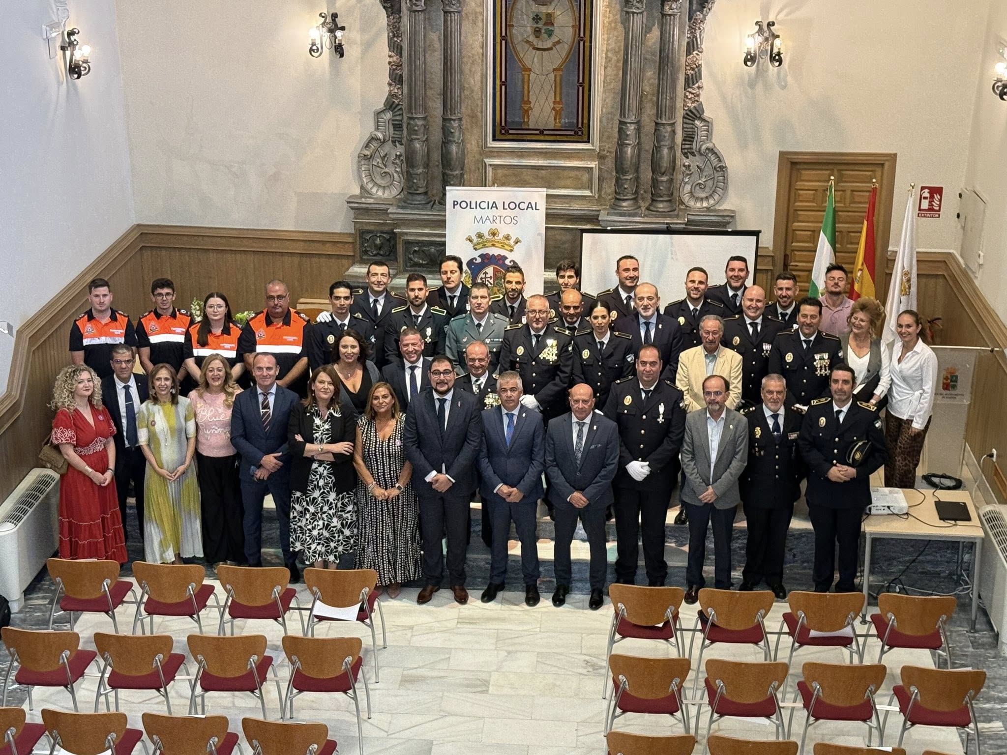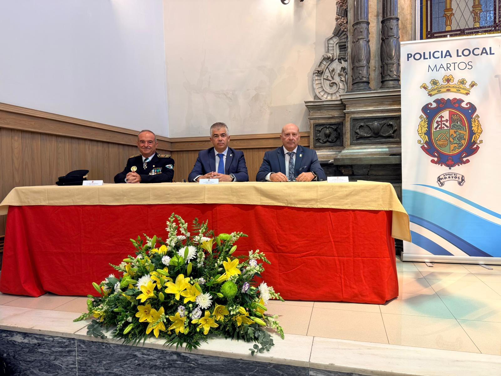 La ceremonia, enmarcada en la festividad de los Santos Ángeles Custodios, patrón de la Policía Local, ha tenido lugar en la Sala Cultural de San Juan de Dios y ha estado presidida por el alcalde de Martos, Emilio Torres; el concejal de Seguridad Ciudadana, Manolo Cortés; y el jefe de la Policía Local, Rafael González