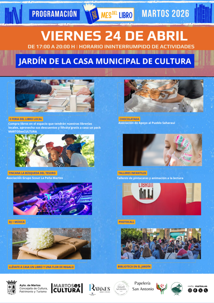Será el 24 de abril, viernes, cuando los jardines de la Casa de la Cultura acojan los actos centrales de esta celebración, con la II Feria Local del libro, en la que las librerías locales serán las grandes protagonistas, el regalo de un libro y un flor a todos los asistentes, talleres, música, y otras propuestas que completaran esta gran fiesta.