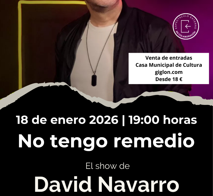 Dará comienzo a las 19:00 hora. David Navarro, reconocido por su amplia trayectoria en el ámbito del monólogo y la comedia nacional, ofrece en esta pieza una mirada irónica y cercana sobre situaciones cotidianas con las que el espectador se sentirá plenamente identificado.