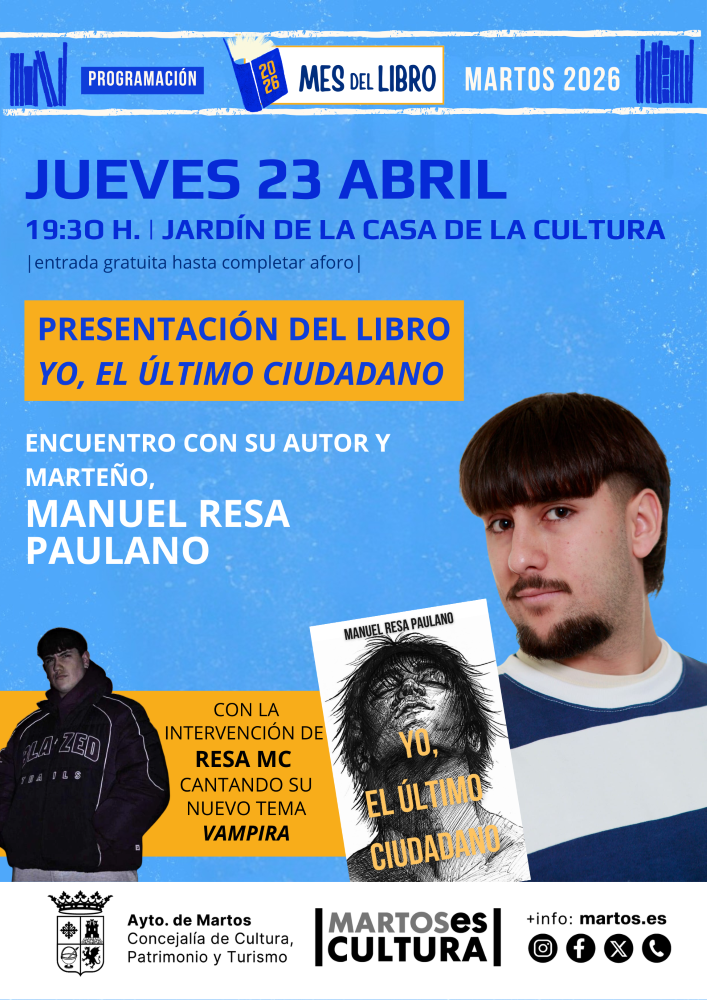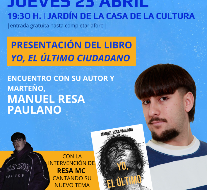Continuando con la programación del Mes del Libro 2026, con motivo del Día del Libro, el 23 de abril, tendrá lugar una propuesta que invita a la reflexión y al análisis social. El escritor y marteño Manuel Resa Paulano, presentará su obra ‘Yo, el último ciudadano’.