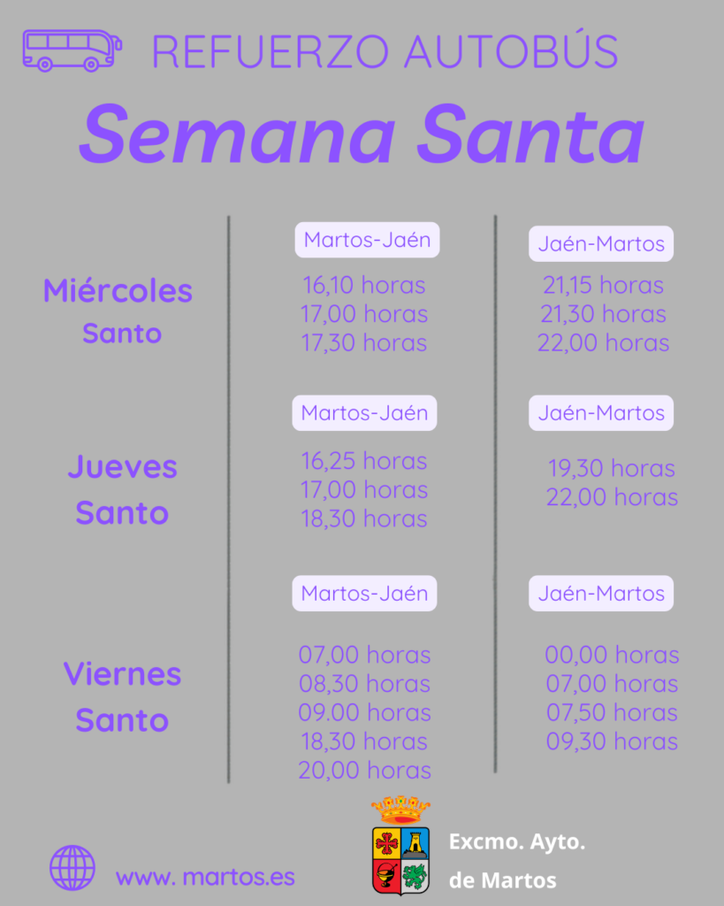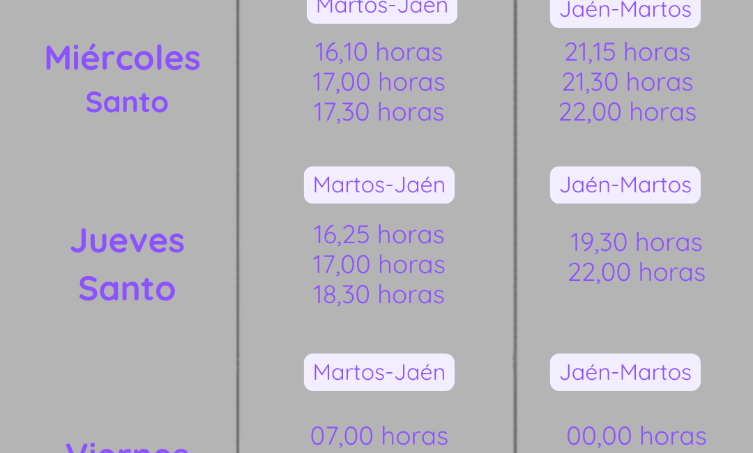 Viernes Santo: horarios de ida Martos a Jaén: 07,00 – 08,30 – 09,00 – 18,30 – 20,00 hrs y, vuelta Jaén a Martos: 00,00 – 07,00 – 07,50 y 09,30 hrs