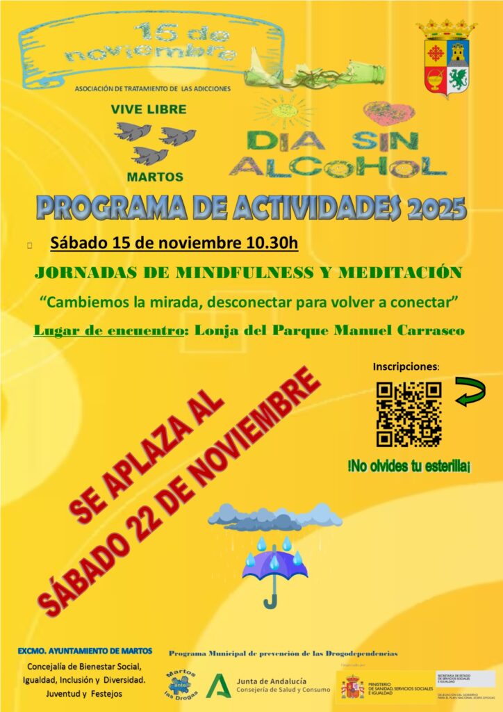 Debido a la previsión de lluvia para mañana sábado,15 de noviembre, nos vemos obligados a aplazar la actividad de mindfulness y meditación en la Lonja que se había preparado para celebrar el día sin alcohol.