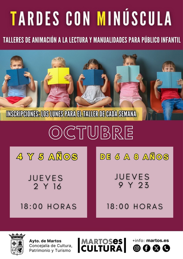 Las inscripciones se abren cada lunes para el taller correspondiente a esa misma semana. Los interesados pueden asegurar su plaza: llamando al 953 210 010, enviando un correo electrónico a martoscultural@martos.es o acudiendo presencialmente a la Casa Municipal de Cultura ‘Francisco Delicado’.