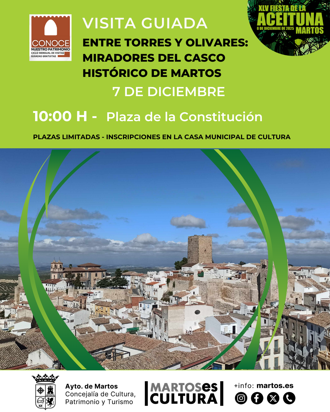 El próximo sábado, día 7 de diciembre, a las 10:00 horas, el patrimonio y los paisajes de Martos serán los protagonistas de una nueva visita guiada bajo el atractivo título “Entre torres y olivares: miradores del casco histórico de Martos”.