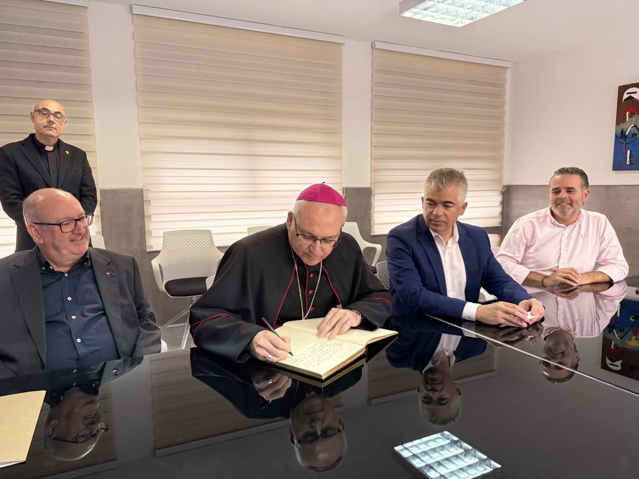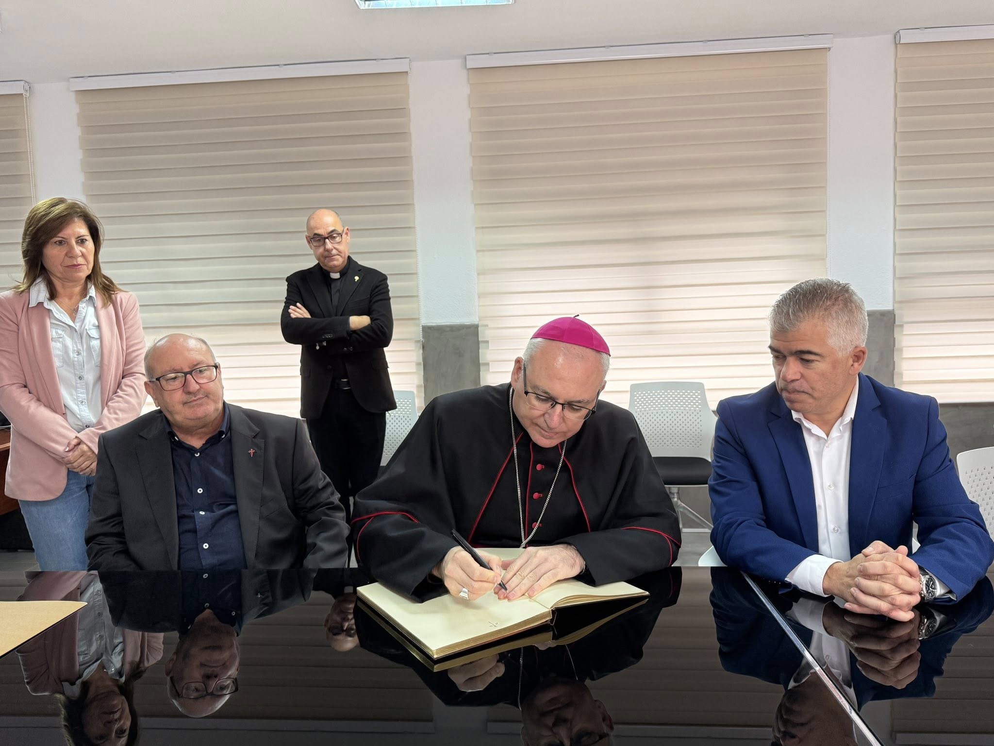 Durante la visita, el obispo ha firmado en el Libro de Honor del Ayuntamiento y ha recibido como obsequio el pin institucional de la ciudad de Martos.