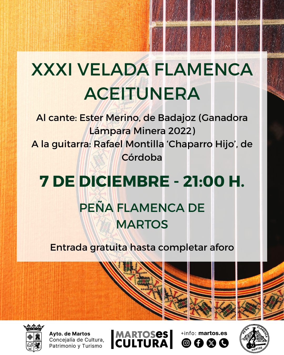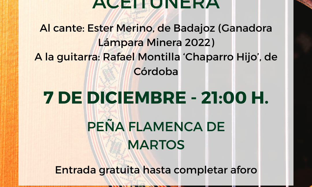 Un año más nuestra tradicional velada flamenca con motivo de la Fiesta de la Aceituna hace su presencia en la programación de esta festividad para deleitarnos con un cartel de lujo. Ester Merino al cante, ganadora de la Lámpara Minera en 2022 y de un virtuoso de la guitarra, Rafael Montilla ‘Chaparro Hijo’.